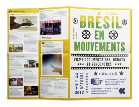 8e édition Brésil en mouvements – Ce dépliant en couleurs a la particularité d’être imprimé sur un papier Cyclus, qui est un papier écolabellisé 100% recyclé respectant le label FSC et l’Ecolabel européen, ce qui confère au support un aspect en accord avec l’esprit du festival.